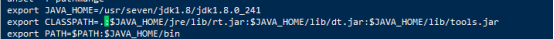 export JAVA_HOME=/usr/seven/jdk1.8/jdk1.8.0_241 export CLASSPATH=.:$JAVA_HOME/jre/lib/rt.jar:$JAVA_HOME/lib/dt.jar:$JAVA_HOME/lib/tools.jar export PATH=$PATH:$JAVA_HOME/bin |