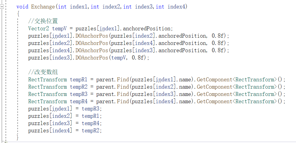 这是主要代码。puzzles是存放九个拼图块的数组,该方法的四个参数分别是要控制的四个拼图块在数组中的索引。第一步是交换位置,我使用了DoTween插件为交换位置的过程添加了动画,这是很普通的位置交换代码(先用临时变量存放第一个拼图块的位置,再依次交换)。之后就是重中之重了: