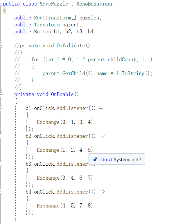 OnValidate方法是我懒得为游戏物体改名,可看我上篇随笔对此方法使用或百度。为四个button添加监听事件,传入的参数是该按钮控制的拼图块在数组中的索引。