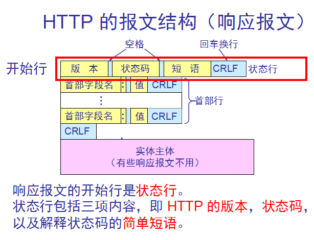 服务器接到请求后,给予相应的响应信息,其格式为一个状态行,包括信息的协议版本号、一个成功或错误的代码,后边是MIME信息包括服务器信息、实体信息和可能的内容。