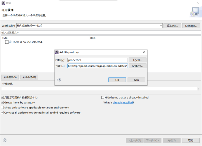 3.安装propertieEditor编辑插件,点击帮助-安装新软件-添加-输入如图-点击OK