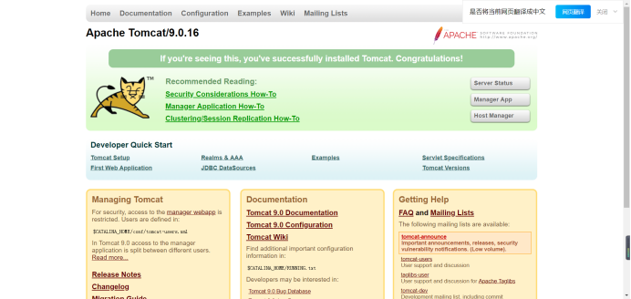 3.打开浏览器 键入 http://localhost:8080 进入如下页面则表示安装成功: