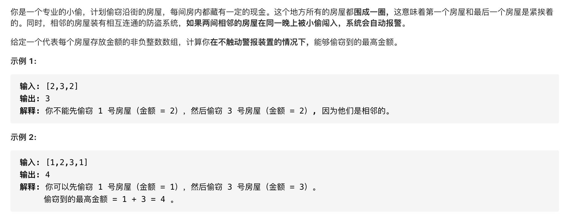 不能闯入相邻房间,房子排列为环,所以第一间房和最后一间房也是相邻房间,所以偷了第一家就不能偷最后一间房,反之亦然。所以考虑偷第一家放弃最后一家和不偷第一家两种情况。