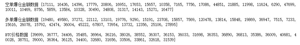 1 #导包 2 import requests #网页请求 3 import jsonpath #json解析 4 import json #json操作 5 from datetime import datetime 6 from bs4 import BeautifulSoup 7 8 #获取json数据中最近30天的buyVolUsd数据 9 def getBuyVolUsd(json_dict): 10 list = [] 11 a = 58 12 b = 88 13 while a < b: 14 temp = jsonpath.jsonpath(json_dict,"$.data[{b}].buyVolUsd".format(b = b)) 15 intdata = int(temp[0]/10000) 16 list.append(intdata) 17 b -= 1 18 list.reverse() 19 return list 20 21 #获取json数据中最近30天的sellVolUsd数据 22 def getSellVolUsd(json_dict): 23 list = [] 24 a = 58 25 b = 88 26 while a < b: 27 temp = jsonpath.jsonpath(json_dict,"$.data[{b}].sellVolUsd".format(b = b)) 28 intdata = int(temp[0]/10000) 29 list.append(intdata) 30 b -= 1 31 list.reverse() 32 return list 33 34 #获取json数据中最近30天的Price数据 35 def getPrice(json_dict): 36 list = [] 37 a = 58 38 b = 88 39 while a < b: 40 temp = jsonpath.jsonpath(json_dict,"$.data[{b}].price".format(b = b)) 41 intdata = int(temp[0]) 42 list.append(intdata) 43 b -= 1 44 list.reverse() 45 return list 46 47 #设置url地址与headers参数 48 json_url = 'https://fapi.bybt.com/api/futures/liquidation/chart?symbol=ALL' 49 headers={'User-Agent':'Mozilla/5.0 (Linux; Android 6.0; Nexus 5 Build/MRA58N) AppleWebKit/537.36 (KHTML, like Gecko) Chrome/91.0.4472.114 Mobile Safari/537.36'} 50 #获取url地址中的json数据 51 json_data = requests.get(url=json_url,headers=headers).text 52 get_json_time = (datetime.now()).strftime('%Y-%m-%d %H:%M:%S') 53 json_dict = json.loads(json_data) #转化为dict字典 54 #调用函数获得列表 55 buy_vol_usd = getBuyVolUsd(json_dict) 56 sell_vol_usd = getSellVolUsd(json_dict) 57 price = getPrice(json_dict) 58 print('空单爆仓金额数据',buy_vol_usd,'\n') 59 print('多单爆仓金额数据',sell_vol_usd,'\n') 60 print('BTC价格数据',price)