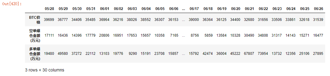 1 import numpy as np 2 import pandas as pd 3 import matplotlib.pyplot as plt 4 plt.rcParams['font.sans-serif']=['SimHei'] #用来正常显示中文标签 5 plt.rcParams['axes.unicode_minus']=False #用来正常显示中文标签 6 index_list = ['BTC价格','空单爆仓金额(万元)','多单爆仓金额(万元)'] 7 buy_data = buy_vol_usd 8 sell_data = sell_vol_usd 9 price_data = price 10 df = pd.DataFrame([price_data,buy_data,sell_data],index = index_list,columns = AllDate) 11 df