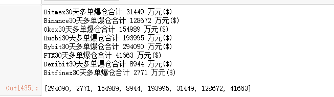 1 BitmexAllSellVolUsdData = getAllBuyData(ExchangeSellVolUsdData[0]) 2 BinanceAllSellVolUsdData = getAllBuyData(ExchangeSellVolUsdData[1]) 3 OkexAllSellVolUsdData = getAllBuyData(ExchangeSellVolUsdData[2]) 4 HuobiAllSellVolUsdData = getAllBuyData(ExchangeSellVolUsdData[3]) 5 BybitAllSellVolUsdData = getAllBuyData(ExchangeSellVolUsdData[4]) 6 FTXAllSellVolUsdData = getAllBuyData(ExchangeSellVolUsdData[5]) 7 DeribitAllSellVolUsdData = getAllBuyData(ExchangeSellVolUsdData[6]) 8 BitfinexAllSellVolUsdData = getAllBuyData(ExchangeSellVolUsdData[7]) 9 AllSellVolUsdDataList = [BybitAllSellVolUsdData,BitfinexAllSellVolUsdData,OkexAllSellVolUsdData,DeribitAllSellVolUsdData, 10 HuobiAllSellVolUsdData,BitmexAllSellVolUsdData,BinanceAllSellVolUsdData,FTXAllSellVolUsdData] 11 print('Bitmex30天多单爆仓合计',BitmexAllSellVolUsdData,'万元($)') 12 print('Binance30天多单爆仓合计',BinanceAllSellVolUsdData,'万元($)') 13 print('Okex30天多单爆仓合计',OkexAllSellVolUsdData,'万元($)') 14 print('Huobi30天多单爆仓合计',HuobiAllSellVolUsdData,'万元($)') 15 print('Bybit30天多单爆仓合计',BybitAllSellVolUsdData,'万元($)') 16 print('FTX30天多单爆仓合计',FTXAllSellVolUsdData,'万元($)') 17 print('Deribit30天多单爆仓合计',DeribitAllSellVolUsdData,'万元($)') 18 print('Bitfinex30天多单爆仓合计',BitfinexAllSellVolUsdData,'万元($)') 19 AllSellVolUsdDataList