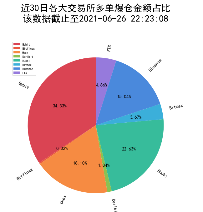 1 Selllabels_list = ['Bybit','Bitfinex','Okex','Deribit','Huobi','Bitmex','Binance','FTX'] 2 plt.pie(AllSellVolUsdDataList,autopct='%1.2f%%',startangle=90,labels = Selllabels_list,textprops = {'fontsize': 15},rotatelabels=True,colors = colors_list) 3 plt.title( '近30日各大交易所多单爆仓金额占比\n该数据截止至{get_json_time}'.format(get_json_time = get_json_time),fontdict = {'fontsize' : 30},y=1.1) 4 plt.legend(loc='upper left') 5 plt.show()