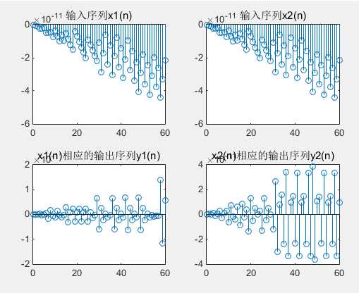 n1 = 0:60; n2 = 0:60; f1 = 200; f2 = 700; %输入序列 x1 = sin(2*pi*f1*n1); x2 = sin(2*pi*f2*n2); %离散系统的差分方程 num = [-1 1]; denum = [1,0.75,0.125]; %输出序列 y1 = filter(num,denum,x1); y2 = filter(num,denum,x2); %绘制信号序列 subplot(2,2,1); stem(n1,x2);title('输入序列x1(n)'); subplot(2,2,2); stem(n2,x2); title('输入序列x2(n)') subplot(2,2,3); stem(n1,y1);title('x1(n)相应的输出序列y1(n)'); subplot(2,2,4); stem(n2,y2);title('x2(n)相应的输出序列y2(n)');