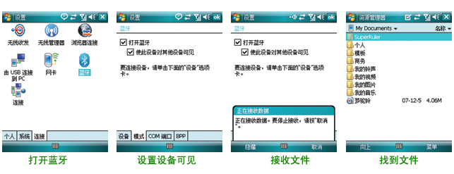首先开启您手机的蓝牙功能,并设备为可见;在电脑上通过蓝牙适配器或者其他蓝牙设备向您的手机发送.cab安装文件,再通过资源(文件)管理器在手机内存\My Documents文件夹找到接收到的安装文件,点击即可安装。见下图示