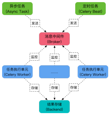 包含异步任务和定时任务. 其中, 异步任务通常在业务逻辑中被触发并发往任务队列, ⽽定时任务由 Celery Beat 进程周期性地将任务发往任务队列.