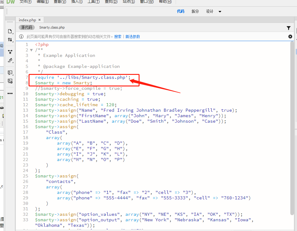 首先,要把我们刚才写的smarty.inc.php文件包括进去,使用include 'smarty.inc.php';,注意,这是smarty.inc.php文件和index.php文件在同一目录下的写法,如果不在同一目录下,注意路径的变化