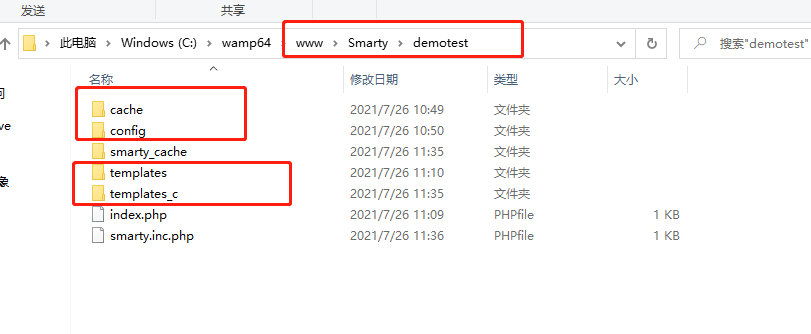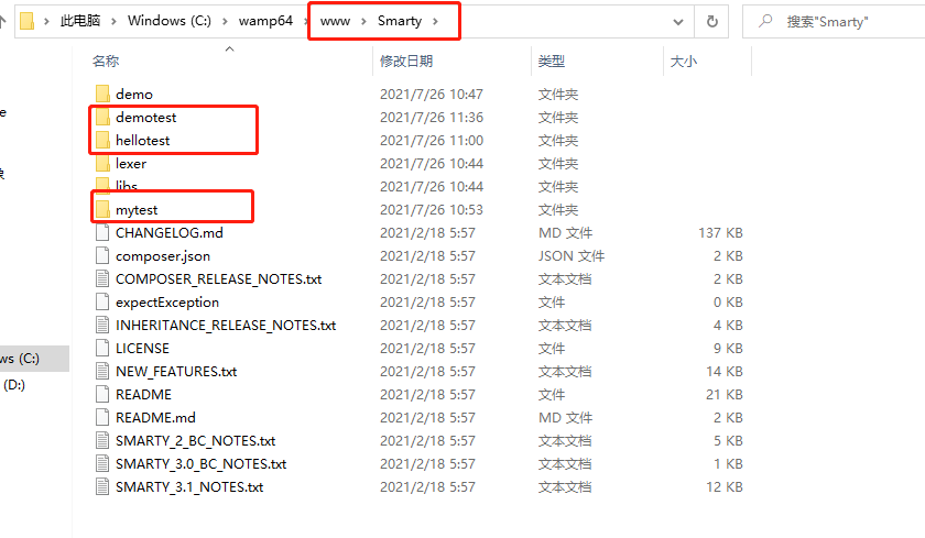 Smarty文件夹里面原有的文件如下,其他未圈起来的文件,是我自己做的测试示例: