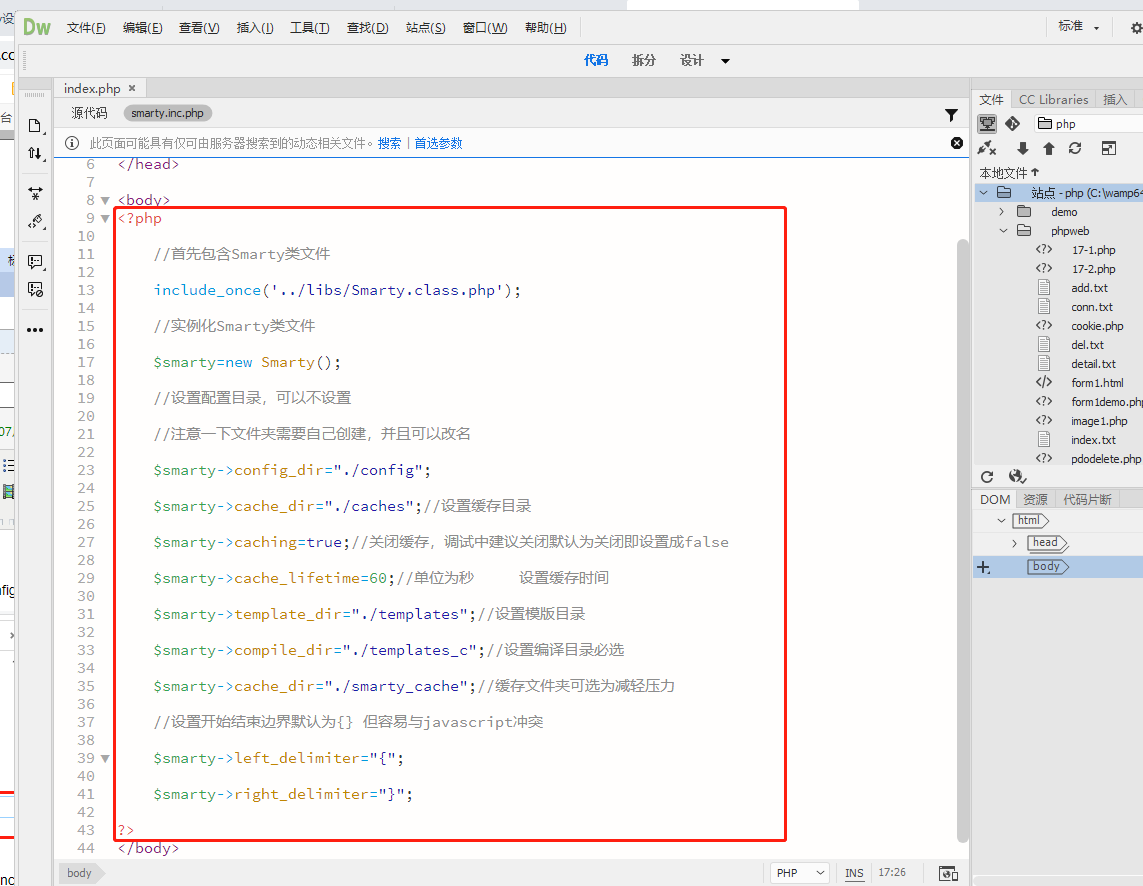 这个文件大家可以复制到自己所有的项目里使用,当然,前提是路径没错,看到第一句代码了吗?那就是我从Smarty文件夹里的demo示例里复制过来的代码,如果你的文件夹和demo示例放在同一层级的路径,这里的代码都可以直接拿来用了,这代码的意义注释也有说明,主要就是设置这个项目的缓存目录,模板目录等等之类。