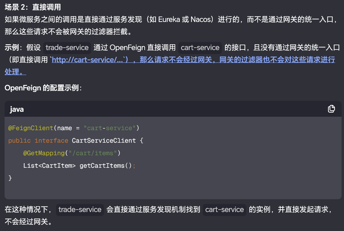 之后就会进行微服务模块代码的运行 假如微服务之间进行调用 还会经历一个openfeign的拦截器 即保存用户的信息到请求头 因为这个是通过openfeign进行发起请求的 是不会被网关部分拦截 已经是网关部分之后的步骤了