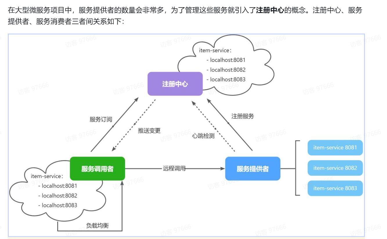 在大型微服务项目中,服务提供者的数量会非常多,为了管理这些服务就引入了注册中心的概念。注册中心、服务提供者、服务消费者三者间关系如下: