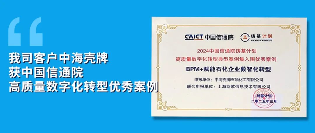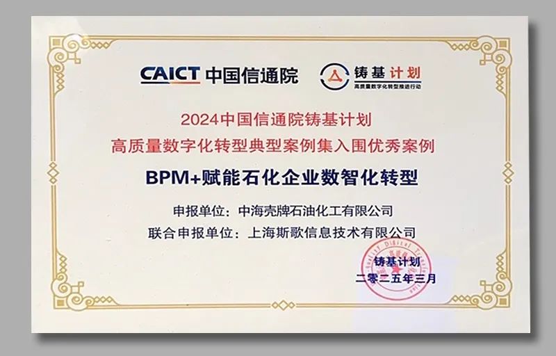 3月28日,中国信通院“铸基计划2025年度会议”在京召开,会上公布了《2024年度高质量数字化转型典型案例(下半年度)》,中海壳牌(中海壳牌石油化工有限公司)携手上海斯歌打造的“BPM+赋能石化企业数智化转型”项目荣获“2024高质量数字化转型入围优秀案例”。