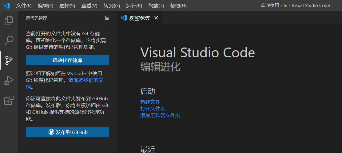 在VSCode中打开文件夹(Ctrl+O),如果项目文件夹里没有Git存储库,打开源代码管理(Ctrl + Shift + G),直接点击“初始化存储库”,即可初始化一个Git本地版本库,如下图所示。