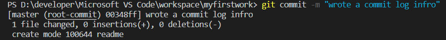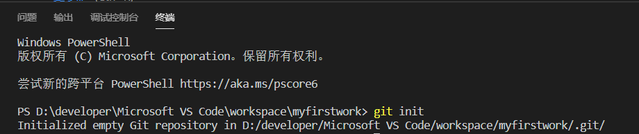 若使用命令行,可以在之前点击"Git Bash Here"弹出的命令行窗口执行git init命令,或者在VSCode中打开终端(Ctrl+ Shift + `),输入git init也可完成初始化一个Git本地版本库,如下图。