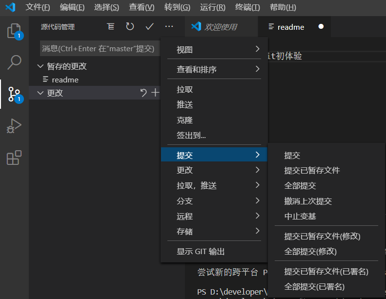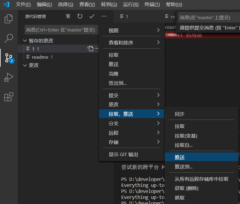 如果要将暂存区的文件提交到仓库,打开源代码管理,只要“暂存的更改”列表里有文件就可以直接点击对号提交,在如下标签栏中也可以提交及撤销提交。
