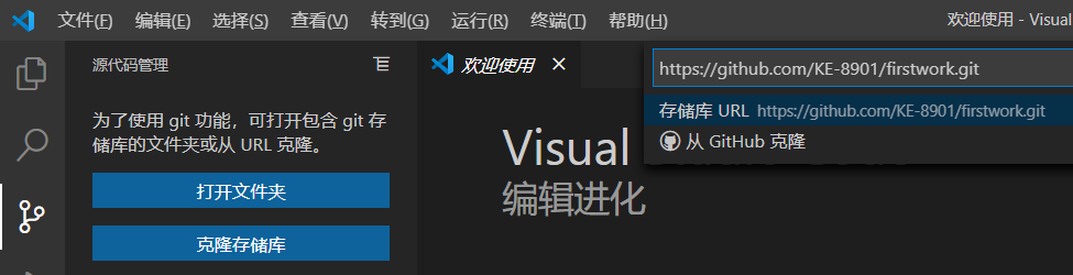 或者在VSCode中打开源代码管理,点击“克隆存储库”,输入存储库URL,点击Enter即可将该版本库克隆到本地。