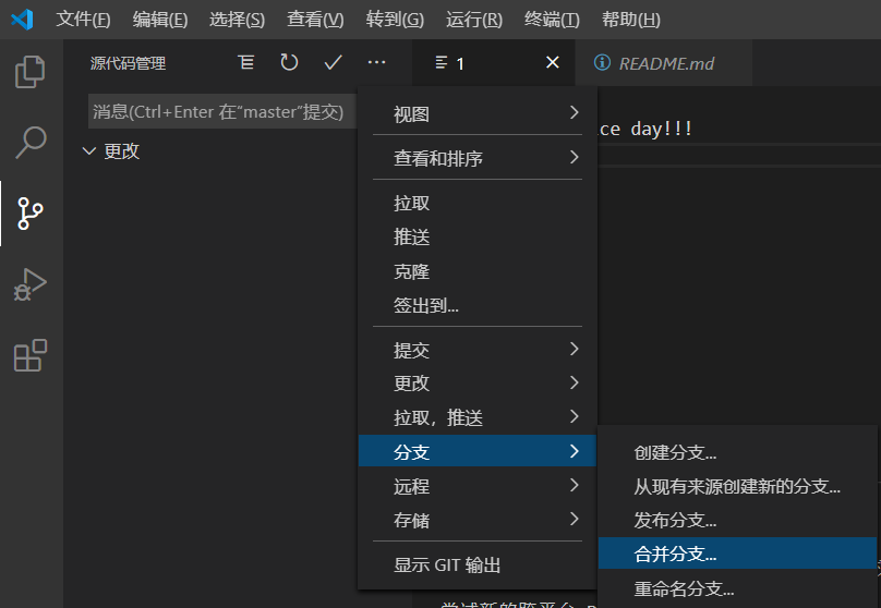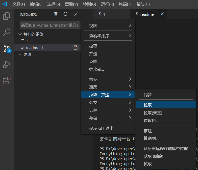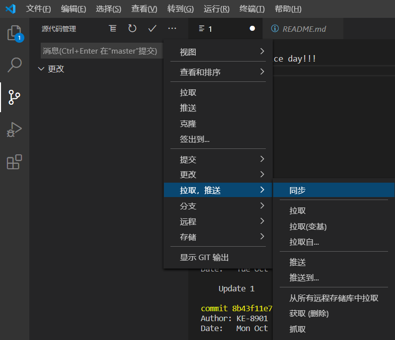如果出现无法同步的情况,这时候需要在本地解决冲突:首先我们通过git pull拉取远程仓库里的提交项到本地仓库并合并到当前分支。在VS Code中版本库有一个菜单命令可以完成git pull的功能,如下图: