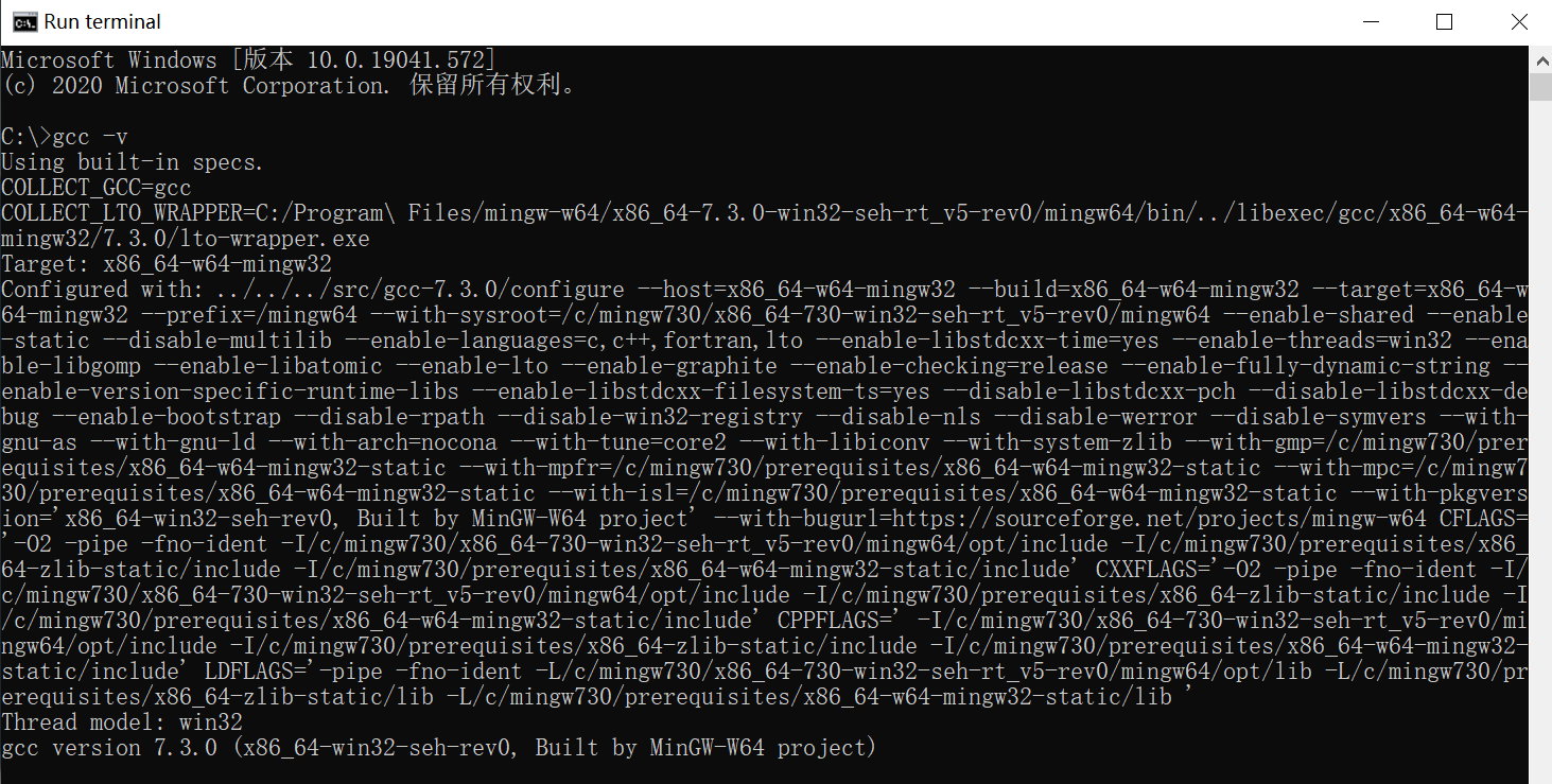 安装完成后,可使用快捷键win+R,输入cmd,打开命令行窗口执行gcc -v查看是否安装成功;或者直接在开始菜单中找到mingw-w64,打开运行终端,进行后续操作。