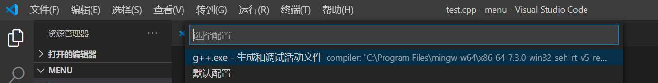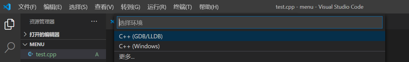 在目录下新建test文件,输入一段简单的helloword小程序,然后点击运行->启动调试,环境选择C++(GDB/LLDB),配置选择g++.exe :