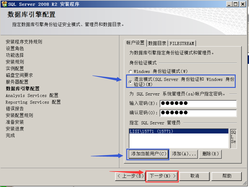 13.数据库引擎配置(选择混合模式,并添加当前账户)