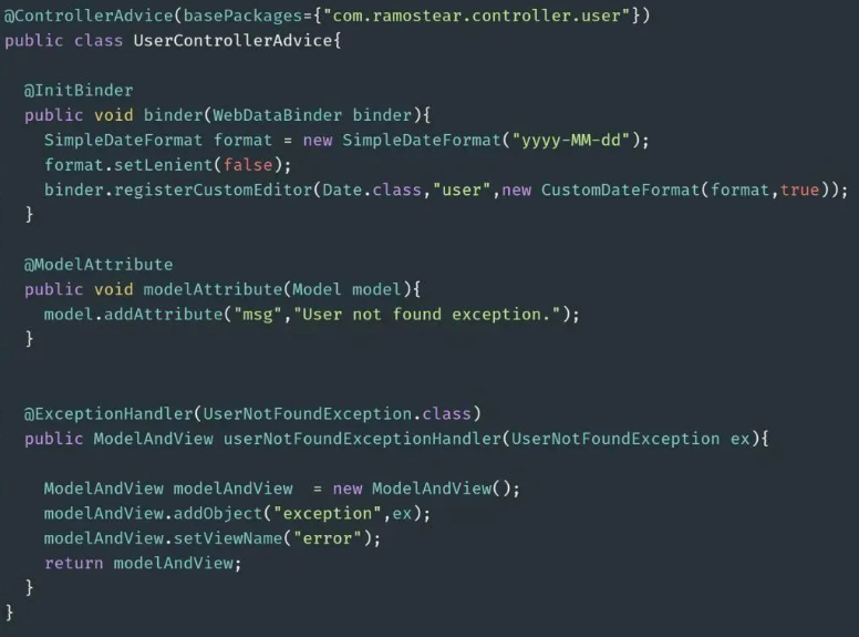 @ControllerAdvice是@Component注解的一个延伸注解,Spring会自动扫描并检测被@ControllerAdvice所标注的类。@ControllerAdvice需要和@ExceptionHandler、@InitBinder以及@ModelAttribute注解搭配使用,主要是用来处理控制器所抛出的异常信息。首先,我们需要定义一个被@ControllerAdvice所标注的类,在该类中,定义一个用于处理具体异常的方法,并使用@ExceptionHandler注解进行标记。此外,在有必要的时候,可以使用@InitBinder在类中进行全局的配置,还可以使用@ModelAttribute配置与视图相关的参数。使用@ControllerAdvice注解,就可以快速的创建统一的,自定义的异常处理类。下面是一个使用@ControllerAdvice的示例代码: