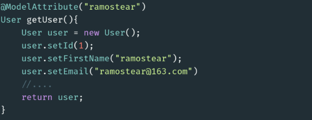如果使用@ModelAttribute对方法进行标注,Spring会将方法的返回值绑定到具体的Model上。示例如下: