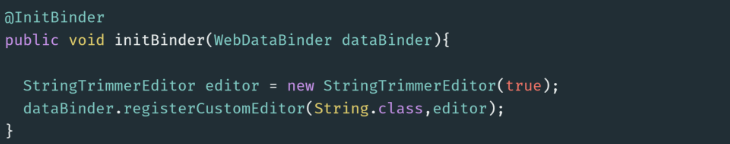 @InitBinder注解用于标注初始化WebDataBinider 的方法,该方法用于对Http请求传递的表单数据进行处理,如时间格式化、字符串处理等。下面是使用此注解的示例: