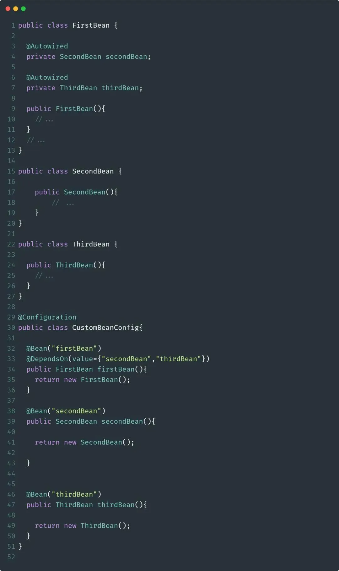 @DependsOn@DependsOn注解可以配置Spring IoC容器在初始化一个Bean之前,先初始化其他的Bean对象。下面是此注解使用示例代码: