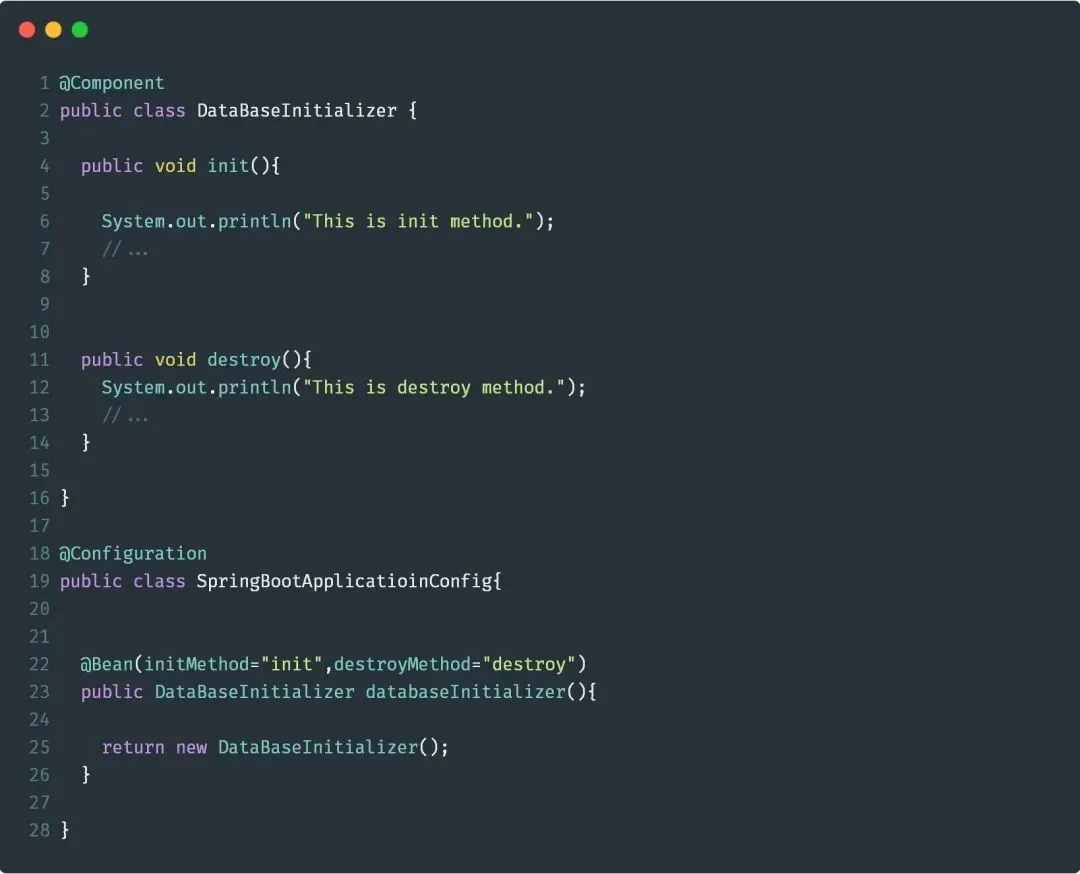 @Bean注解主要的作用是告知Spring,被此注解所标注的类将需要纳入到Bean管理工厂中。@Bean注解的用法很简单,在这里,着重介绍@Bean注解中initMethod和destroyMethod的用法。示例如下: