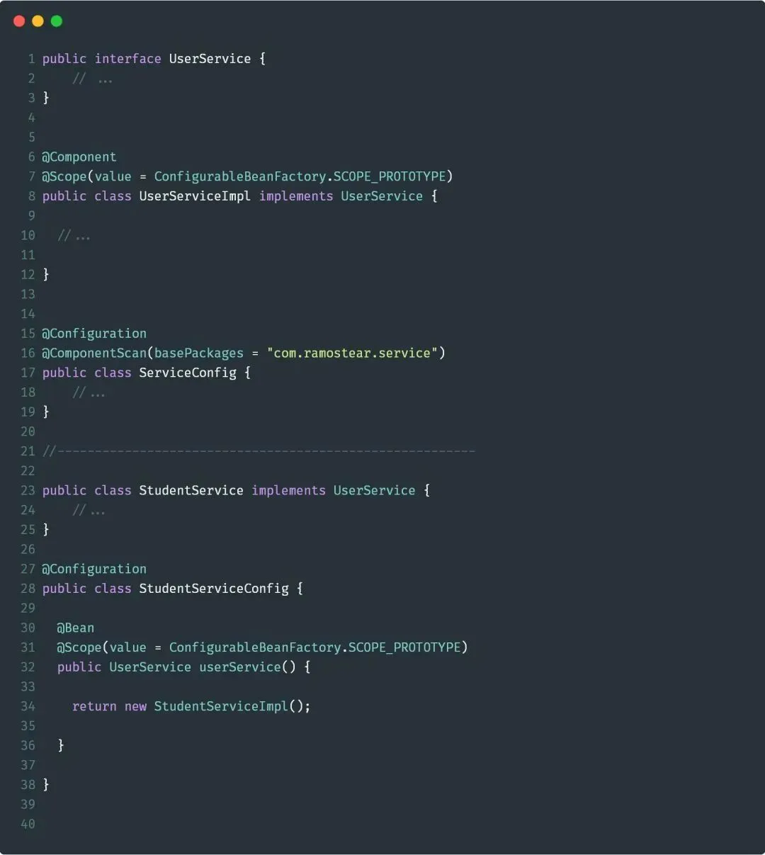 @Scope注解可以用来定义@Component标注的类的作用范围以及@Bean所标记的类的作用范围。@Scope所限定的作用范围有:singleton、prototype、request、session、globalSession或者其他的自定义范围。这里以prototype为例子进行讲解。当一个Spring Bean被声明为prototype(原型模式)时,在每次需要使用到该类的时候,Spring IoC容器都会初始化一个新的该类的实例。在定义一个Bean时,可以设置Bean的scope属性为prototype:scope=“prototype”,也可以使用@Scope注解设置,如下:
