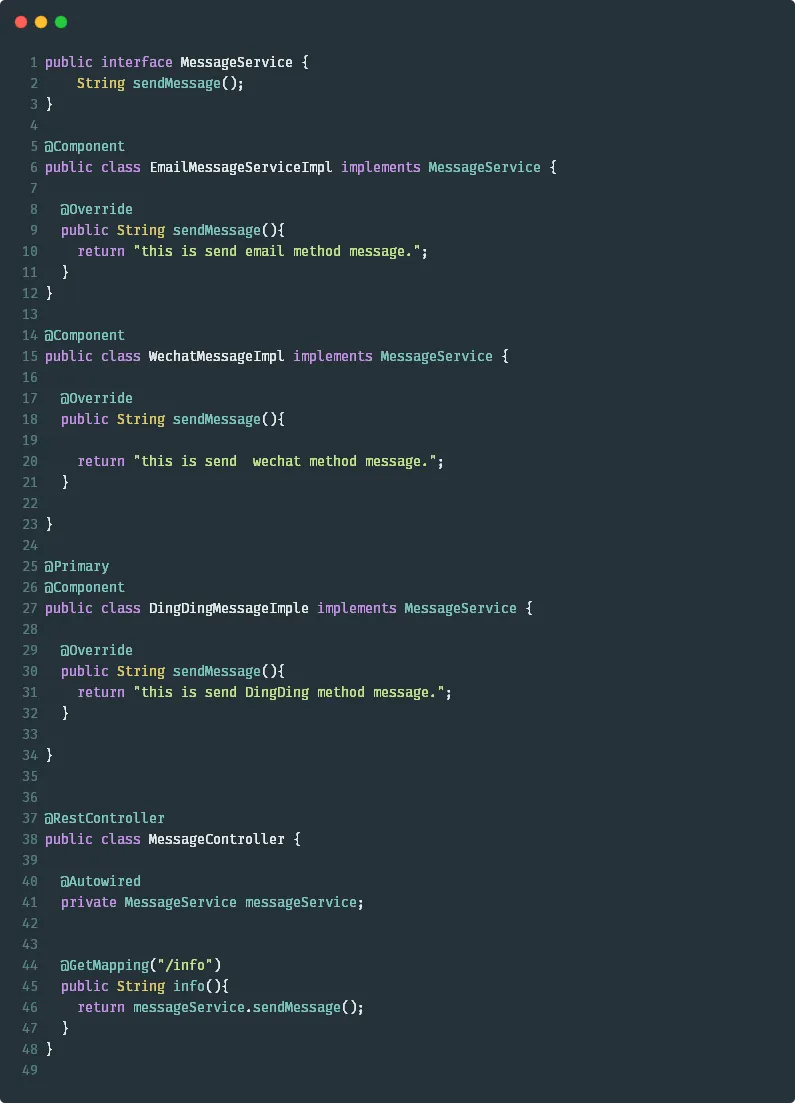当系统中需要配置多个具有相同类型的bean时,@Primary可以定义这些Bean的优先级。下面将给出一个实例代码来说明这一特性: