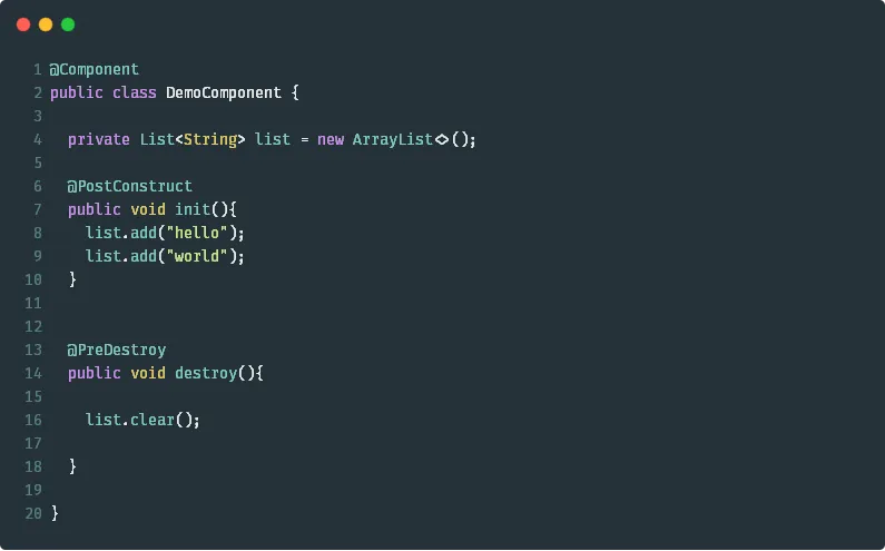 值得注意的是,这两个注解不属于Spring,它们是源于JSR-250中的两个注解,位于common-annotations.jar中。@PostConstruct注解用于标注在Bean被Spring初始化之前需要执行的方法。@PreDestroy注解用于标注Bean被销毁前需要执行的方法。下面是具体的示例代码: