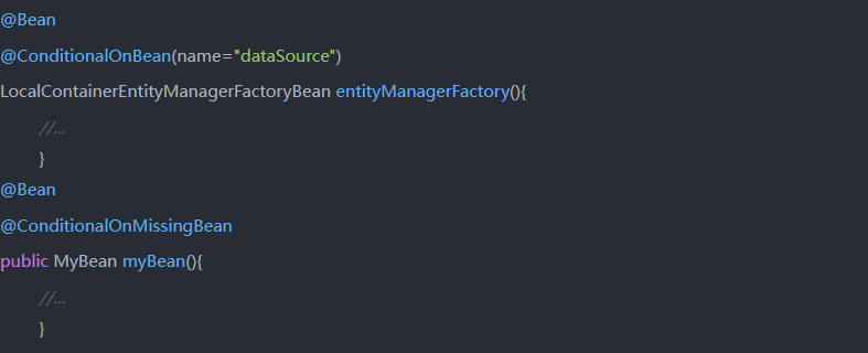 这两个注解属于对象条件注解,根据是否存在某个对象作为依据来决定是否要执行某些配置方法。示例代码如下: