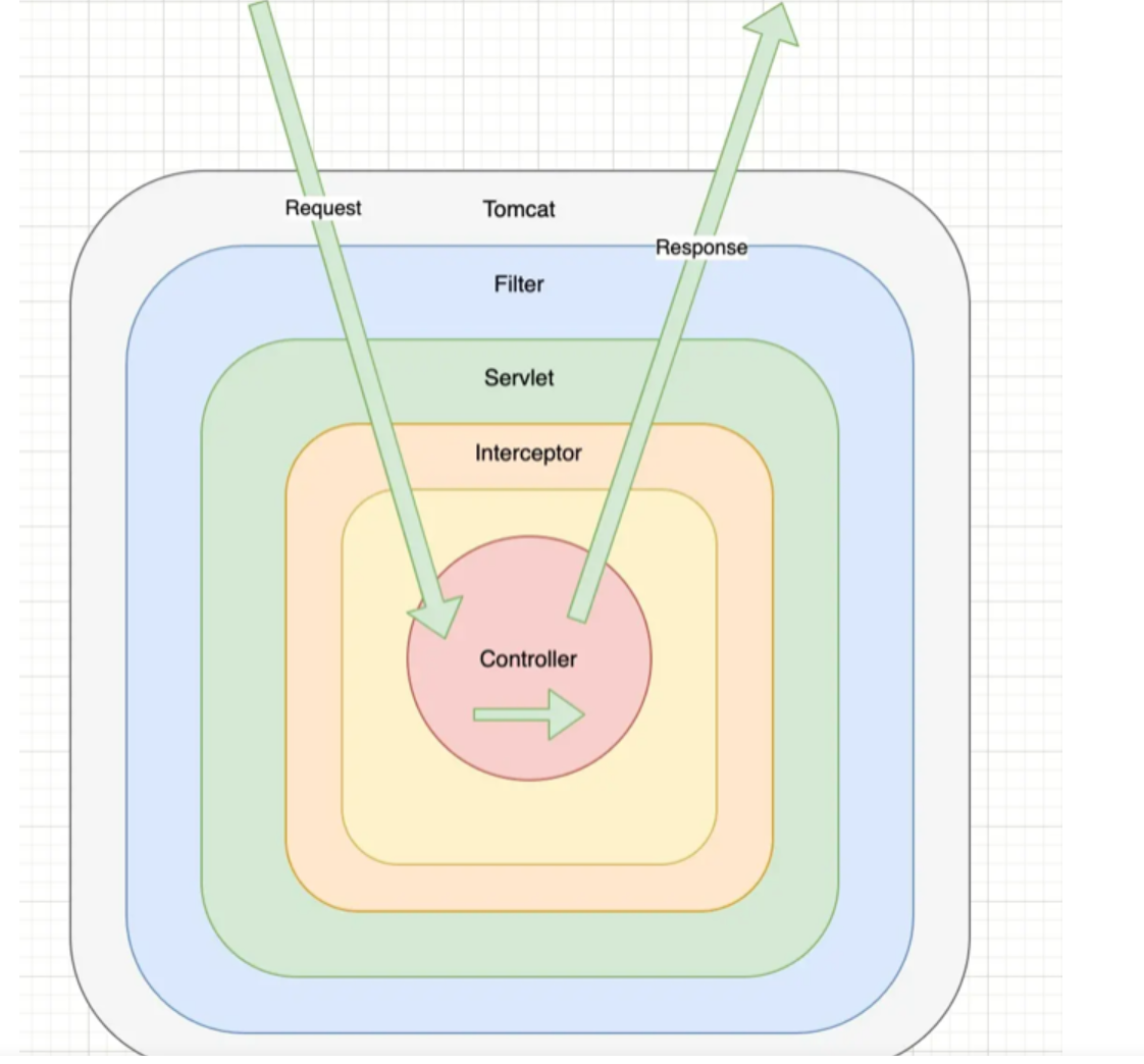 请求进入容器 > 进入过滤器 > 进入Servlet > 进入拦截器 > 进入控制器(Controller)
