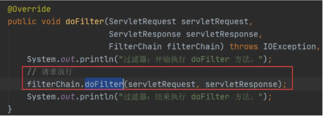 System.out.println("过滤器:开始执行 doFilter 方法。");