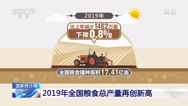 从粮食播种面积看,初步统计,2019年全国粮食播种面积17.41亿亩,比上年减少1462万亩,下降0.8%。