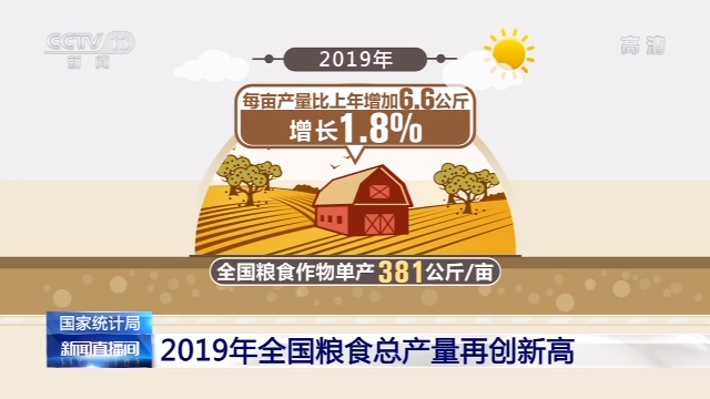 从总产量看,2019年,全国粮食总产量13277亿斤,比2018年增加119亿斤,增长0.9%。