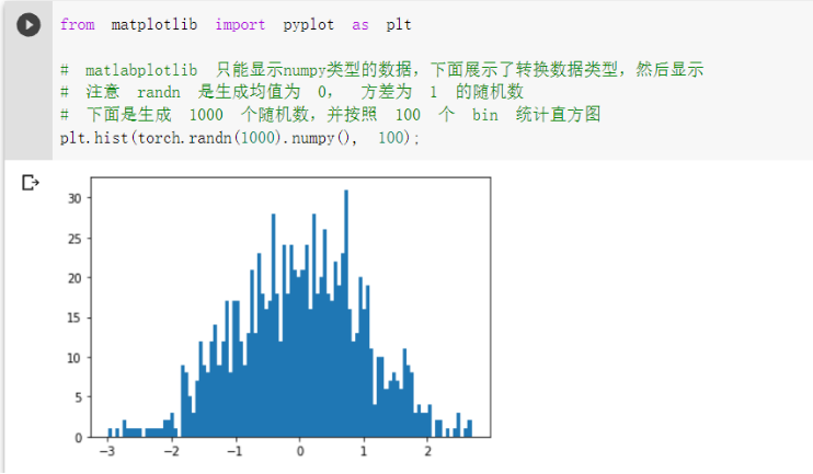 torch.randn(n):返回n个均值为0方差为1的标准正态分布的随机数,numpy()用于转换数据类型