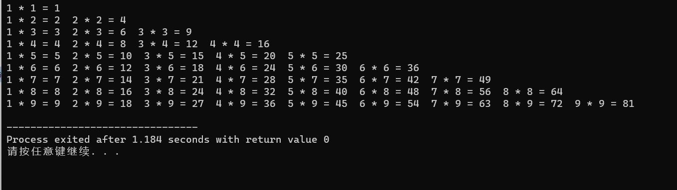 1 #include<stdio.h> 2 int main(){ 3 int i,j; 4 for(i=1;i<=9;i++){ 5 for(j=1;j<=i;j++){ 6 printf("%d * %d = %d ",j,i,j*i); 7 } 8 printf("\n"); 9 } 10 return 0; 11 }