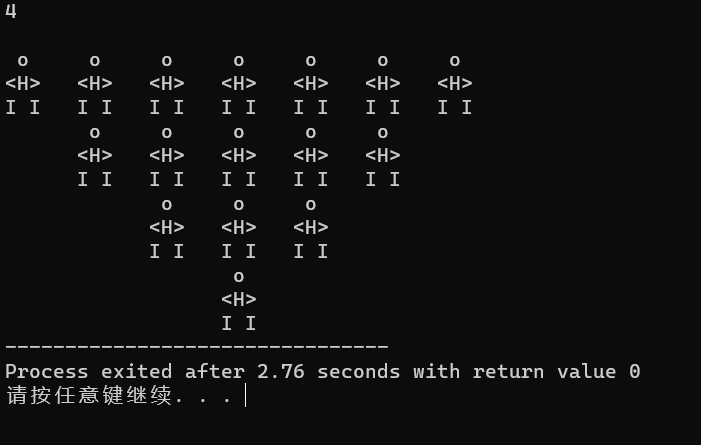 1 #include<stdio.h> 2 #include<string.h> 3 int main(){ 4 int i,j,k,n; 5 char c[10]; 6 scanf("%d",&n); 7 for(k=n;k>=1;k--){ 8 for(i=1;i<=3;i++){ 9 if(i==1){ 10 strcpy(c," o "); 11 if(k<=n) 12 printf("\n"); 13 } 14 if(i==2){ 15 printf("\n"); 16 strcpy(c,"<H>"); 17 } 18 if(i==3){ 19 printf("\n"); 20 strcpy(c,"I I"); 21 } 22 for(j=1;j<=2*n-1;j++){ 23 if(k>n-j&&k>j-n) 24 printf("%s ",c); 25 else 26 printf(" "); 27 } 28 } 29 } 30 return 0; 31 }