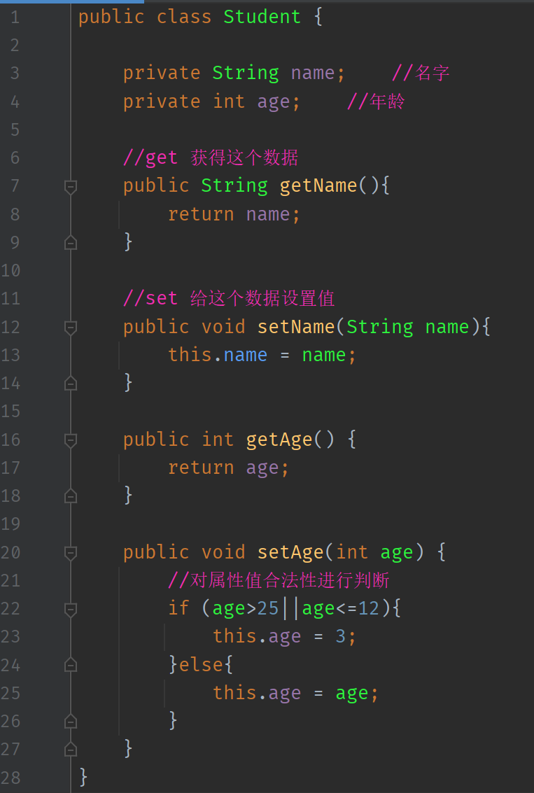 用一个学生类封装为列,主要属性有姓名,年龄。代码: