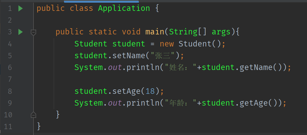在这个测试类Application 中 main() 方法中调用student属性的 setXxx() 方法对其相应的属性进行赋值,并调用 getXxx() 方法访问属性。代码: