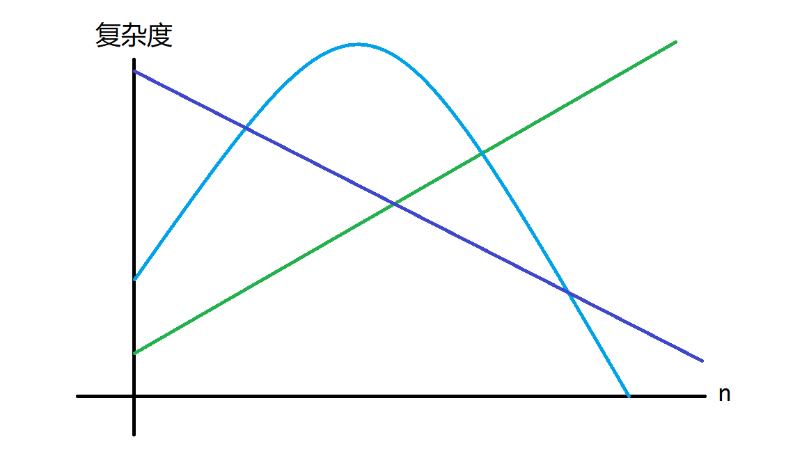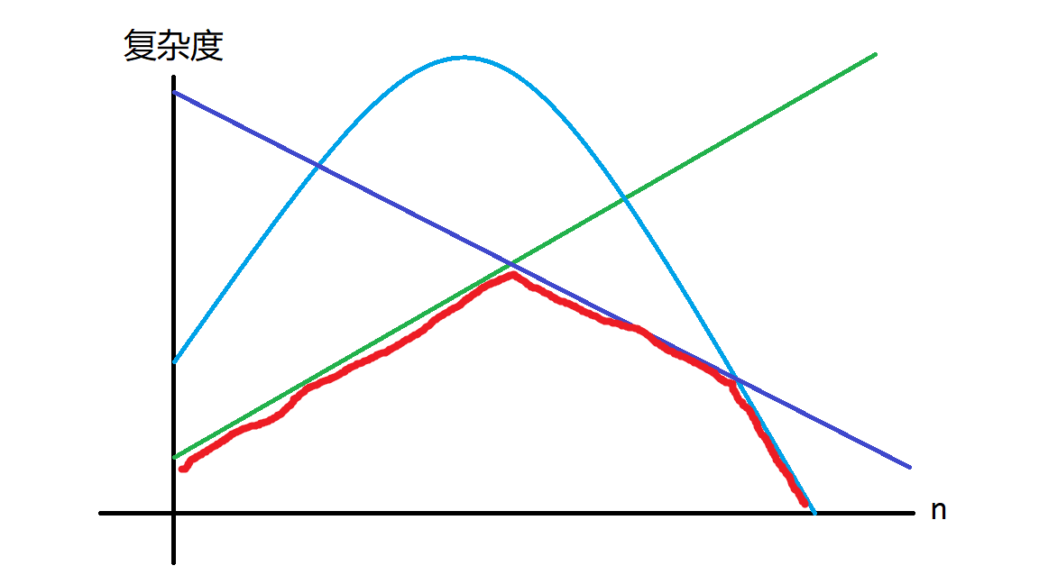 回到一开头的定义来——通过这道题我们可以看到,有一些算法的复杂度随着 \(n\) 的增大而增大,但还有另外一些算法的复杂度随着 \(n\) 的增大而减小。如果我们把这些算法时间复杂度随 \(n\) 变化的关系画到一个函数图像上,那么其就像这样:
