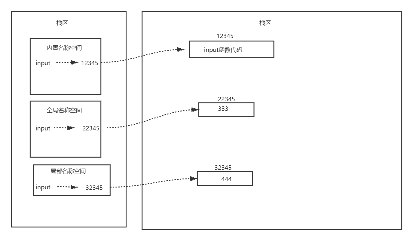 input = 333 def func(): # 2执行函数体内代码 input = 444 # 3局部变量名称input=444,将444的内存地址绑定给局部变量名称input func() # 1调用函数,回到函数定义函数阶段 print(input) # 4调用print函数,在全局名称空间查找input,通过input找到对应的内存地址