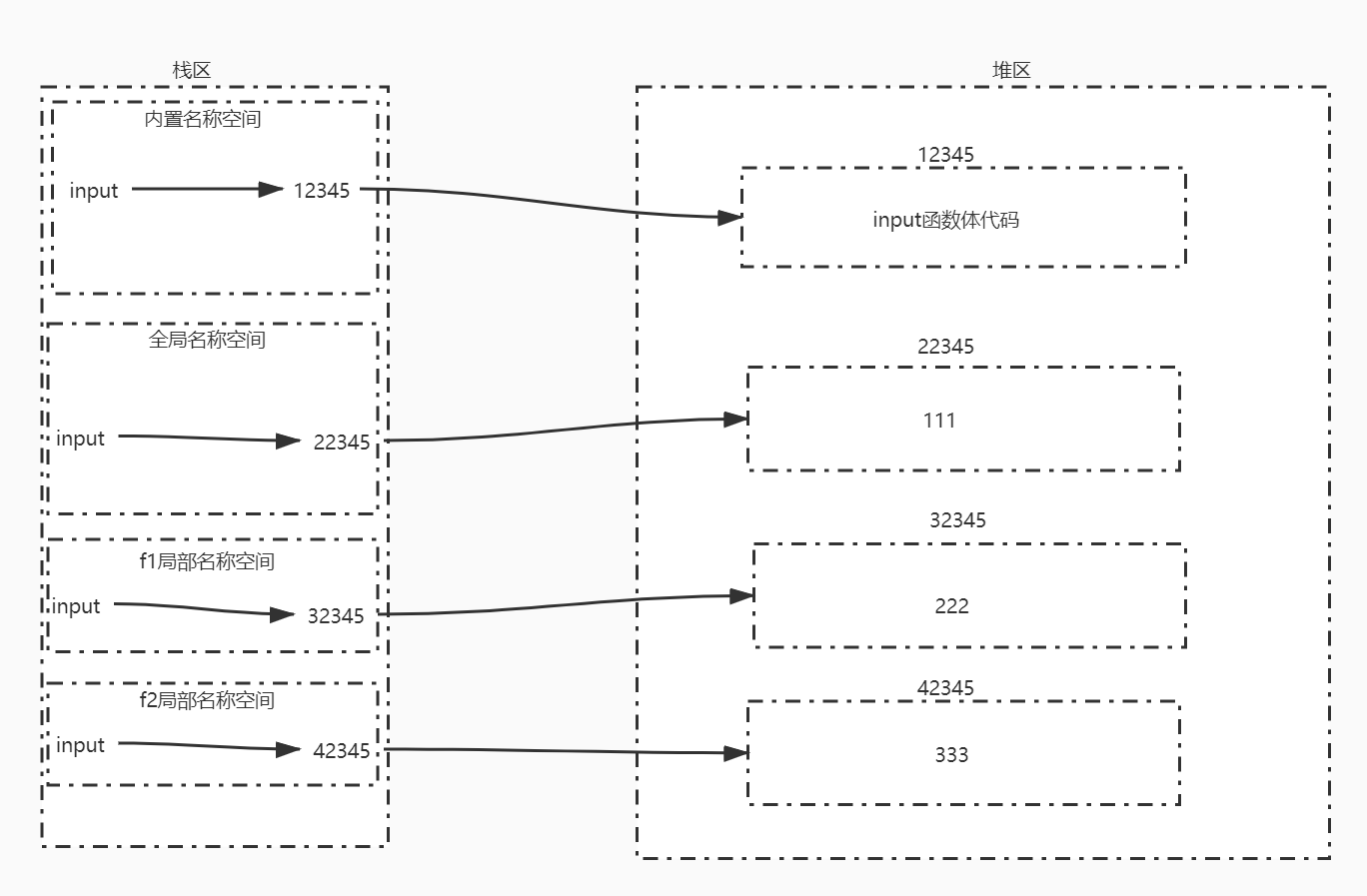 input=111 def f1(): # 2执行f1函数体内的代码 def f2(): # 5执行f2函数体内的代码 input=333 # f2局部名称空间中input=333 print(input) # 调用print函数,在当前位置查找x,找到f2局部名称空间中存在x,通过x找到对应的内存地址 input=222 # 3 f1局部名称空间中input=222 f2() # 4调用f2函数,回到定义f2函数的阶段 f1() # 1调用f1函数,回到定义f1函数的阶段