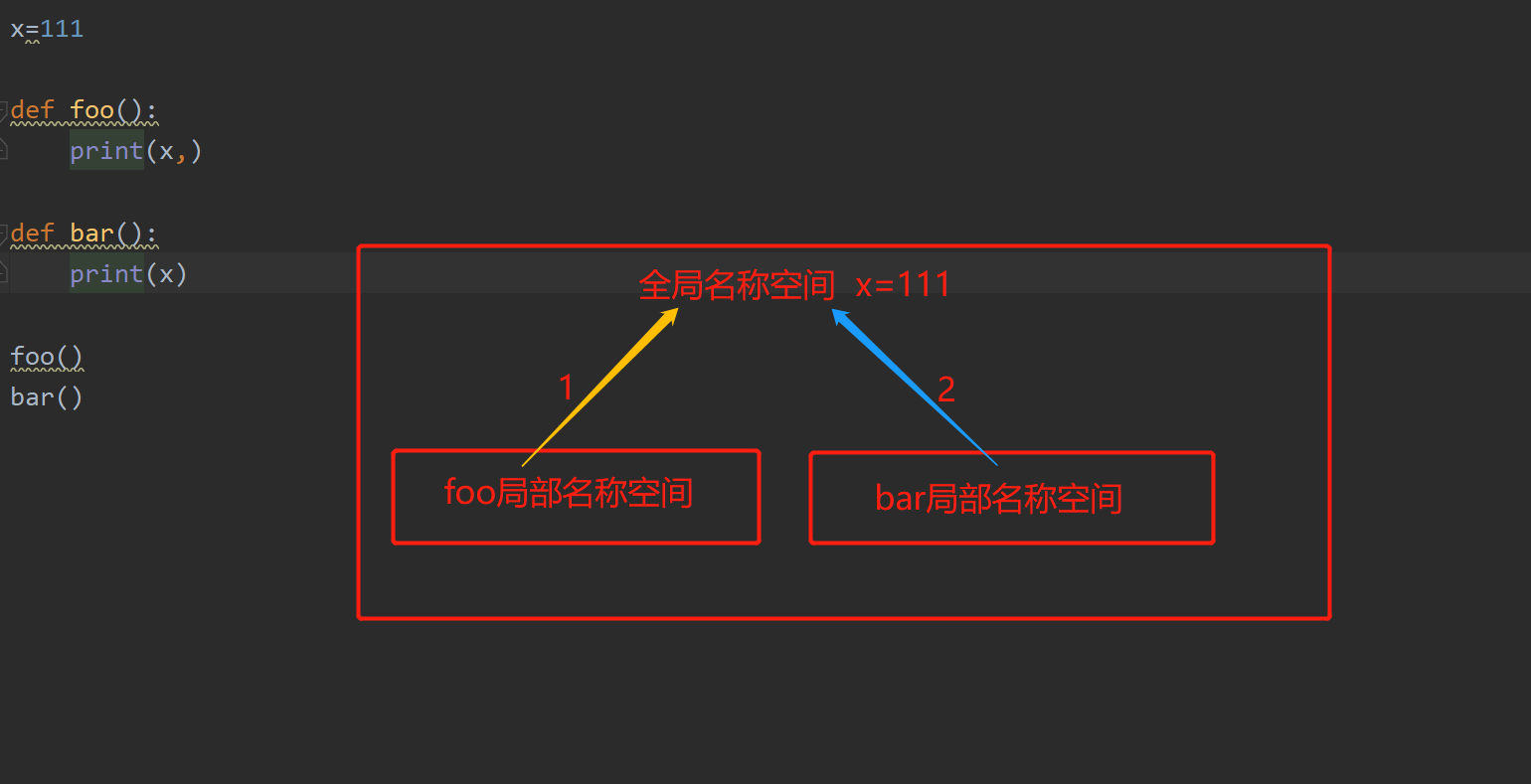 x=111 #4在全局空间中找到x #9在全局空间中找到x def foo(): # 2执行foo函数体内的代码 print(x,) # 3调用print函数,从当前位置寻找x,未找到,去全局名称空间找x # 5将x传值给print函数,通过x找到对应的内存地址 def bar(): #7执行bar函数体内的代码 print(x)# 8调用print函数,从当前位置寻找x,未找到,去全局名称空间找x # 10将x传值给print函数,通过x找到对应的内存地址 foo() #1调用foo函数,回到foo函数定义阶段 bar() # 6调用bar函数,回到bar函数定义阶段